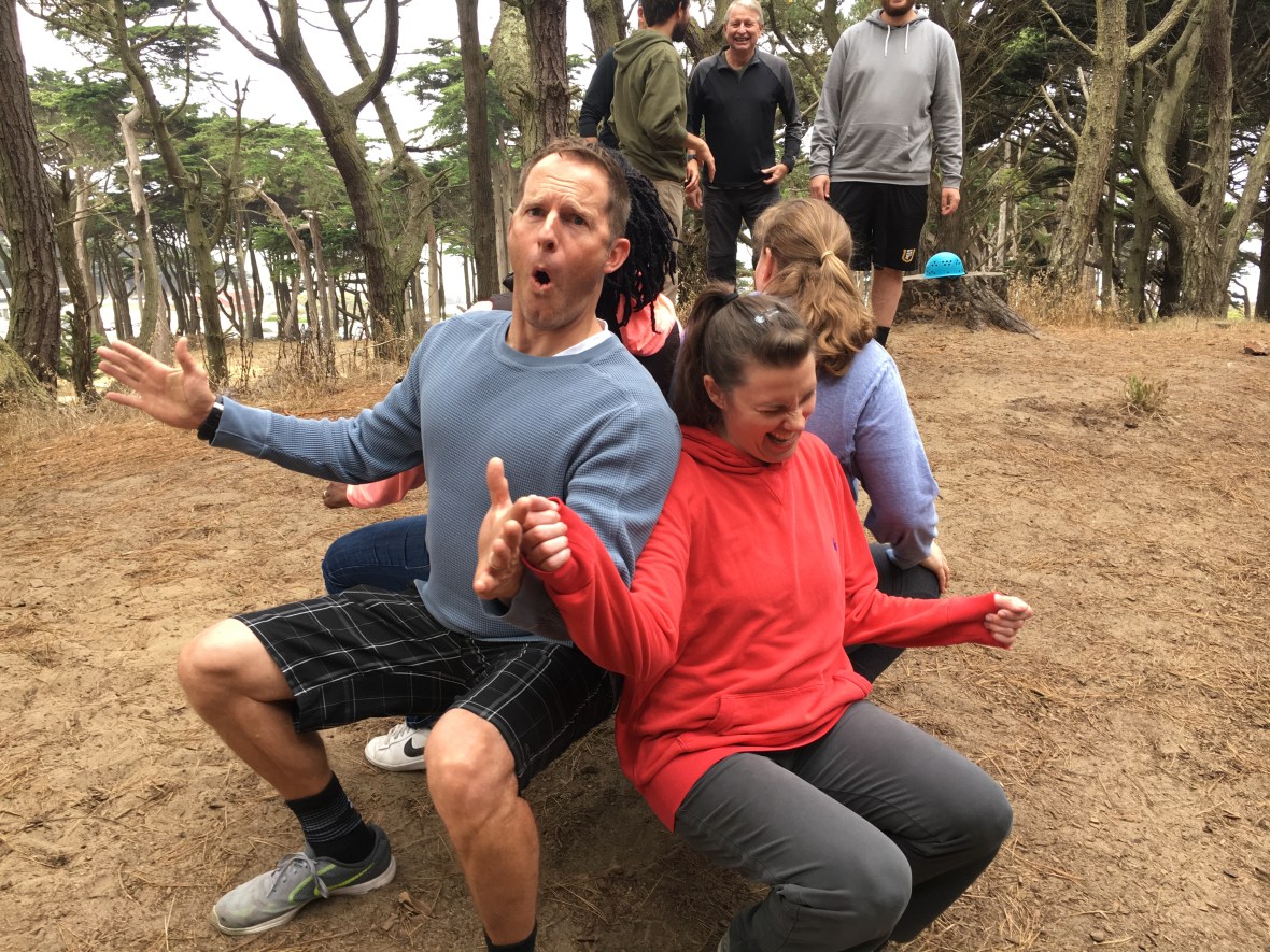 Team challenge – get from wooden box A to B by making a bridge with only two planks. Getting cozy while providing some counterbalance. BEST part: debriefing the experience and reflecting on how a big group tried to make decisions – often with good ideas getting drowned out by louder voices. Hmmm…implications for organizational well-being? (Rhetorical question)